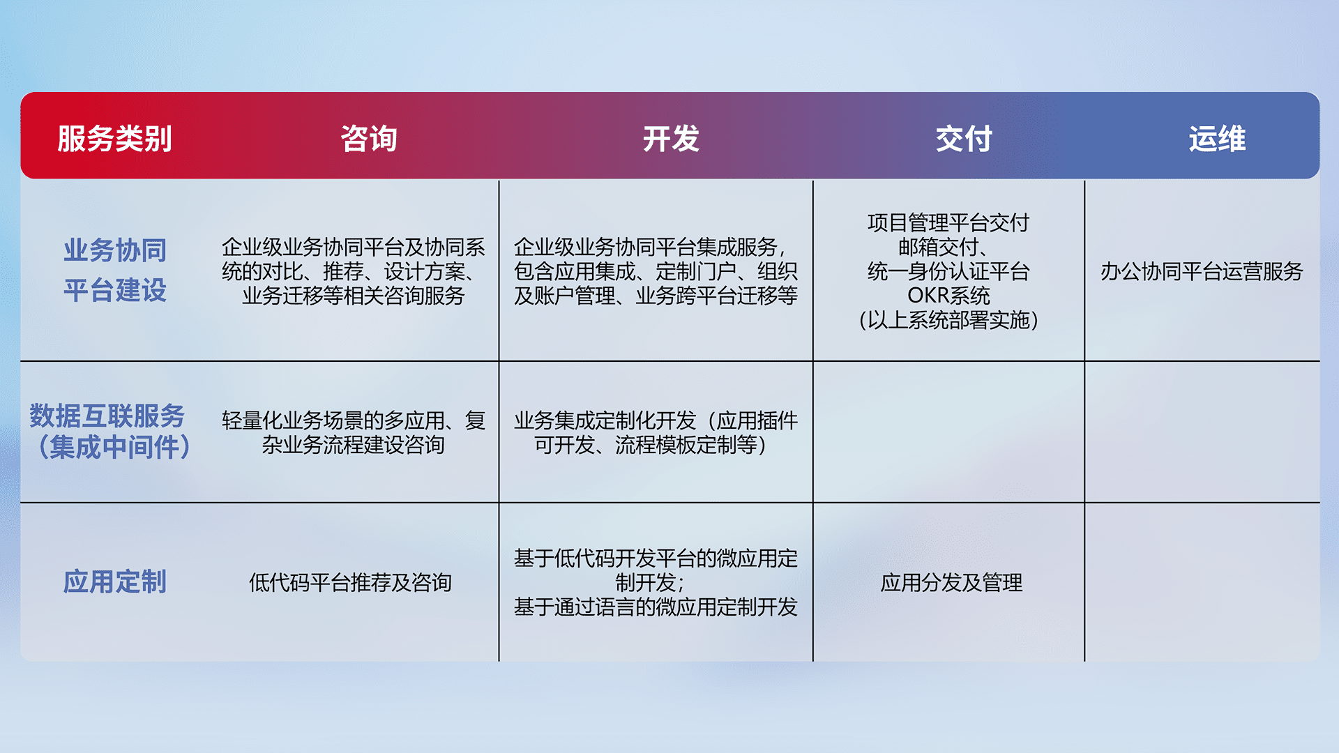 针对钉钉、、企微、、、、IDaas等平台级产品提供产品的规划、、、方案、、、、交付、、、、定制化开发等服务,,,实现如统一协同办公、、、、智能客户服务、、、、混合会议管理、、智能数据查询、、、、等业务场景,,,实现数字化转型。。。